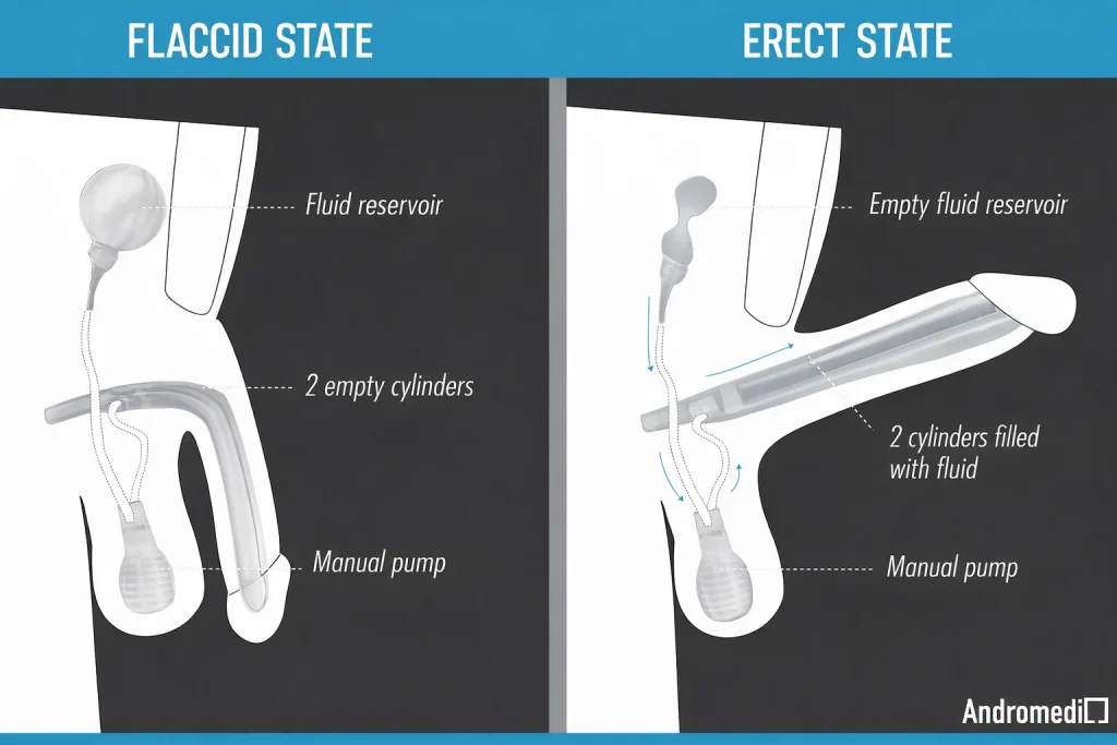 - When the man desires an erection, he activates the hand pump, which causes fluid to be transferred from the reservoir to the inside of the cylinders, creating a rigidity similar to that of a natural erection.